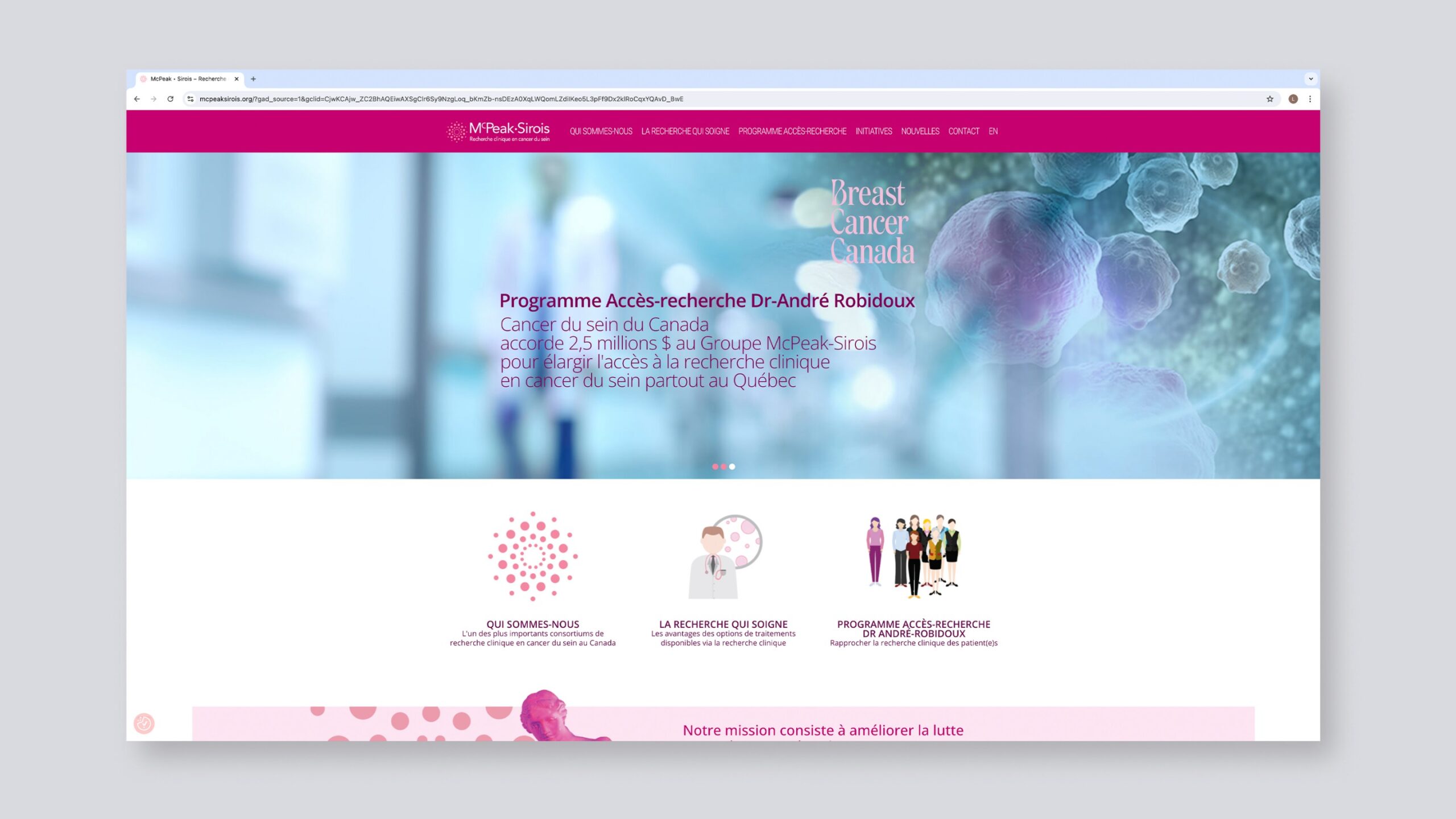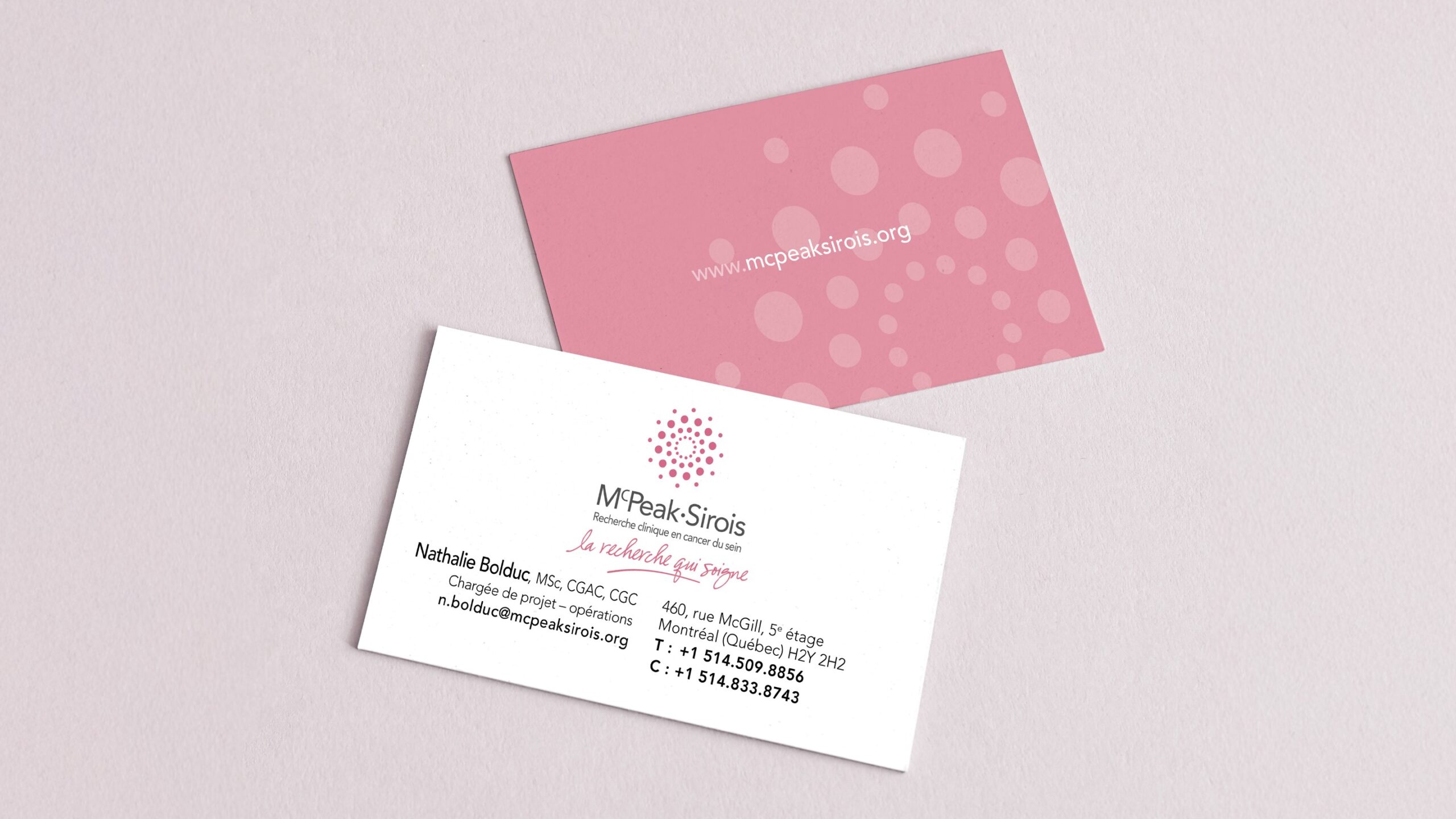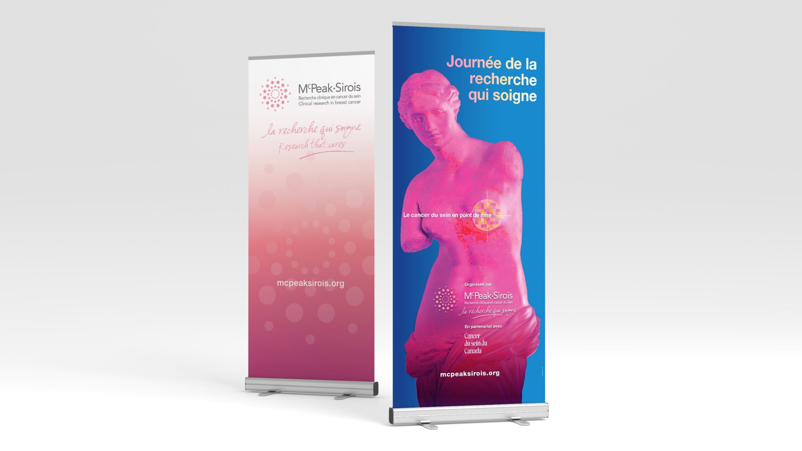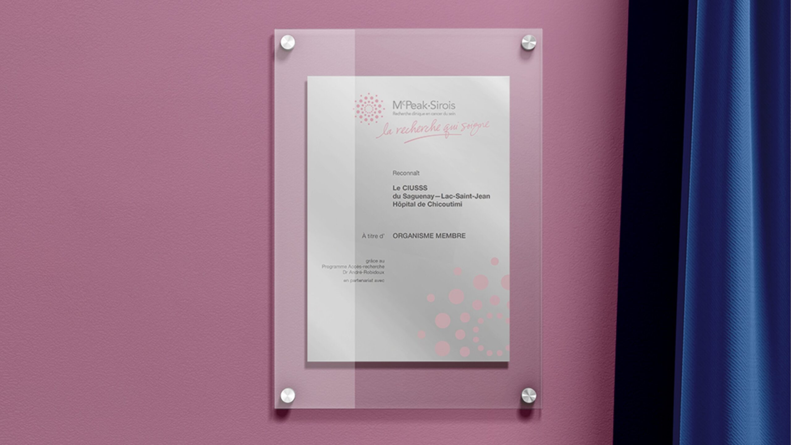 Conception de l’identité visuelle du Groupe McPeak-Sirois, un consortium québécois dédié à la recherche clinique en cancer du sein. Notre mandat comprenait la création du logo, le développement de divers supports imprimés et numériques, ainsi que la conception de plaques et de signalisation. Son identité visuelle incarne son engagement envers l’innovation et la collaboration.